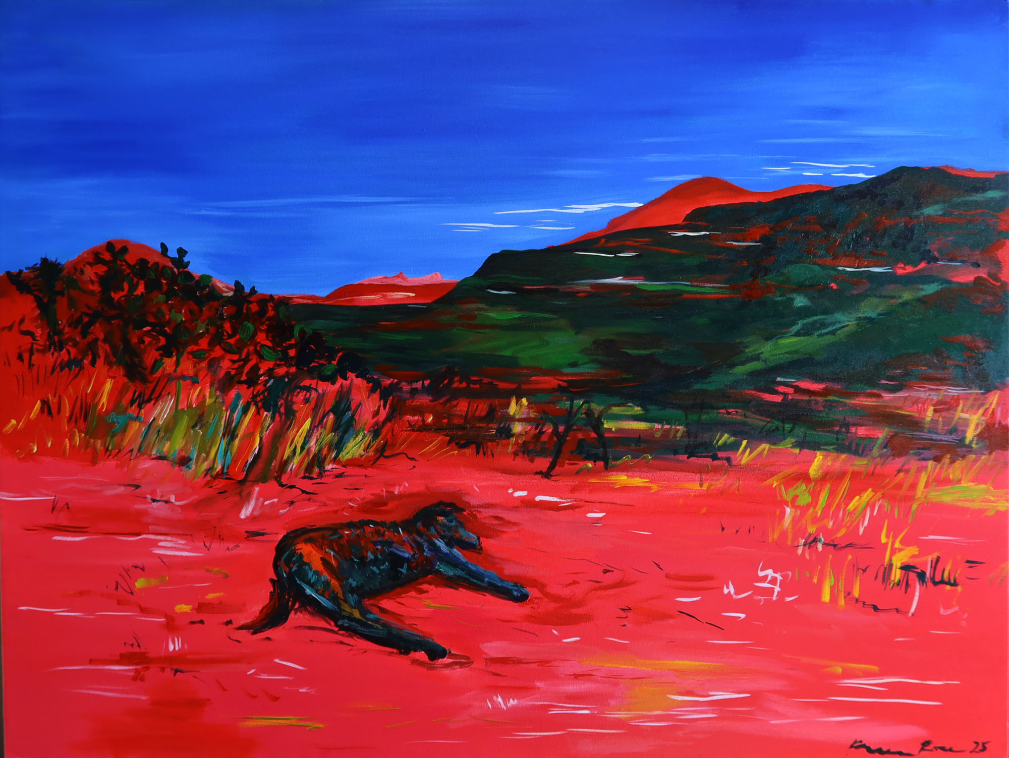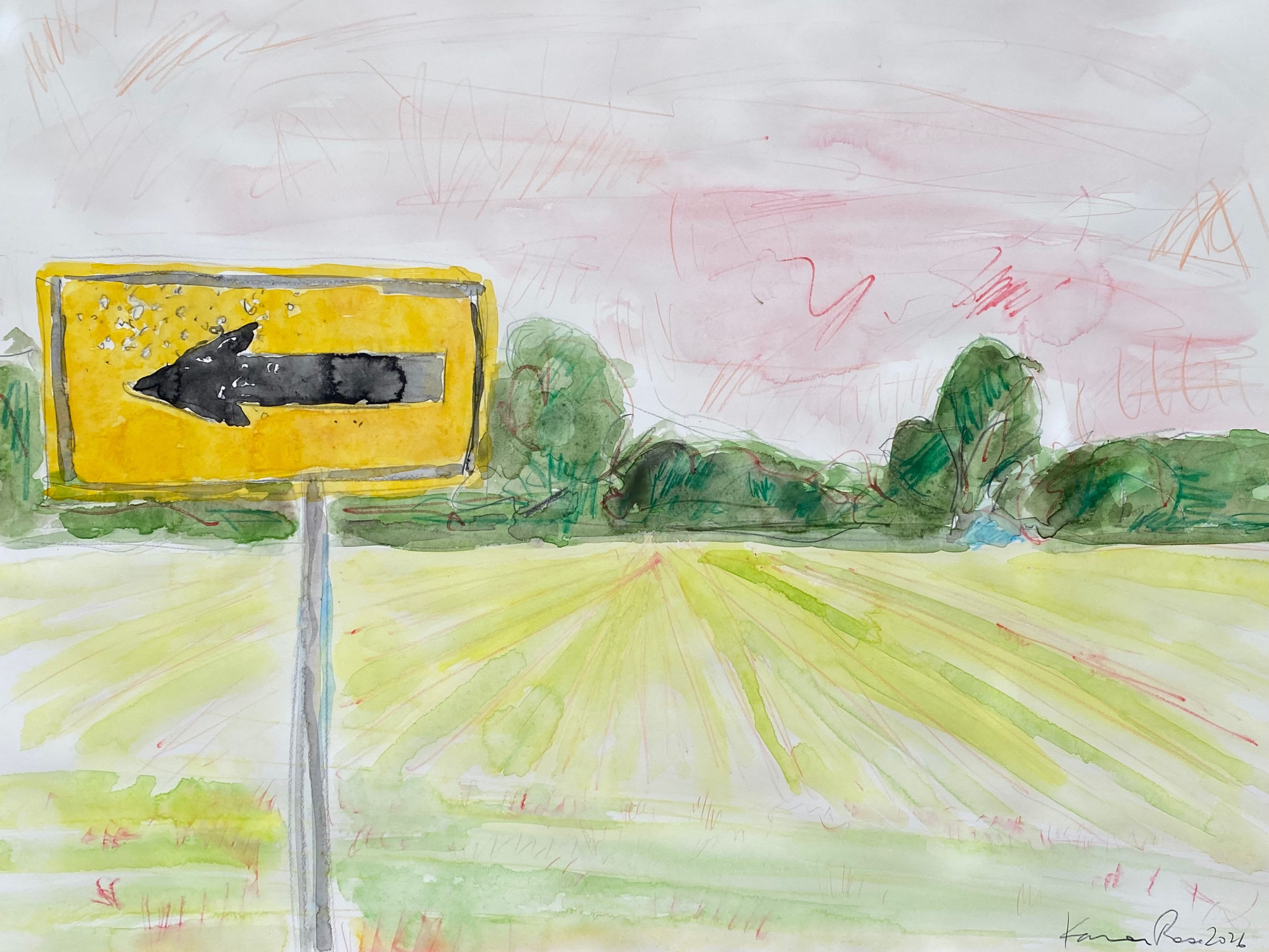 American Avenue, 2025 oil, acrylic and pastel on canvas 32 x 48" American Avenue is the road that leads to Del Rey in the great San Joaquin Valley flanked by almond and orange groves where my grandfather worked for decades.