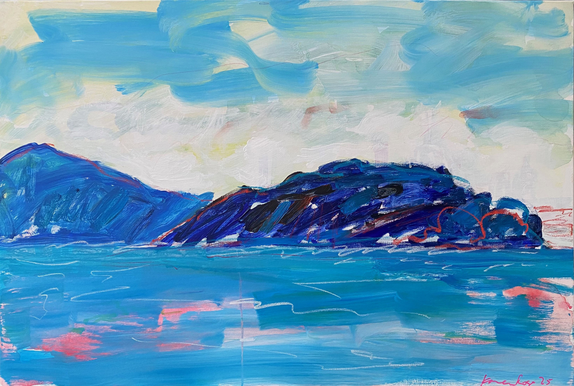 Angel Island, 2025 oil, acrylic, pastel on canvas 36 x 48" View from my studio window, painted without the former immigration center, now a museum. "While the exact number is unknown, estimates suggest that between 1910 and 1940, the station processed up to one million Asian and other immigrants, including 250,000 Chinese and 150,000 Japanese ...Thousands of immigrants detained on Angel Island endured the station's prison-like environment." - NPS website. Also served as a Japanese internment camp during WWII. Painted with the color palette of the American flag, striped water, and stars layered under the fog.