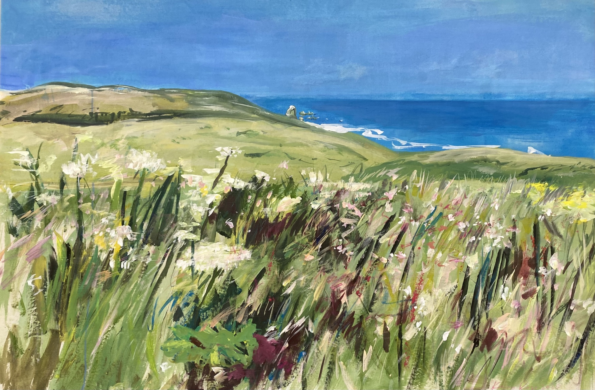 Tomales Point, 2025 oil and acrylic on canvas 43 x 54" From my photograph, featuring the coastal native cobweb thistle on a 12 mile walk I took on a clear spring day, through shoulder high yellow lupine. In Point Reyes National Seashore, near the historic dairy and beef farms that have been shut down to save the tule elk, promote native plants, prevent toxic runoff into the ocean, unfortunately also displacing family ranchers and their mostly Latino workers.