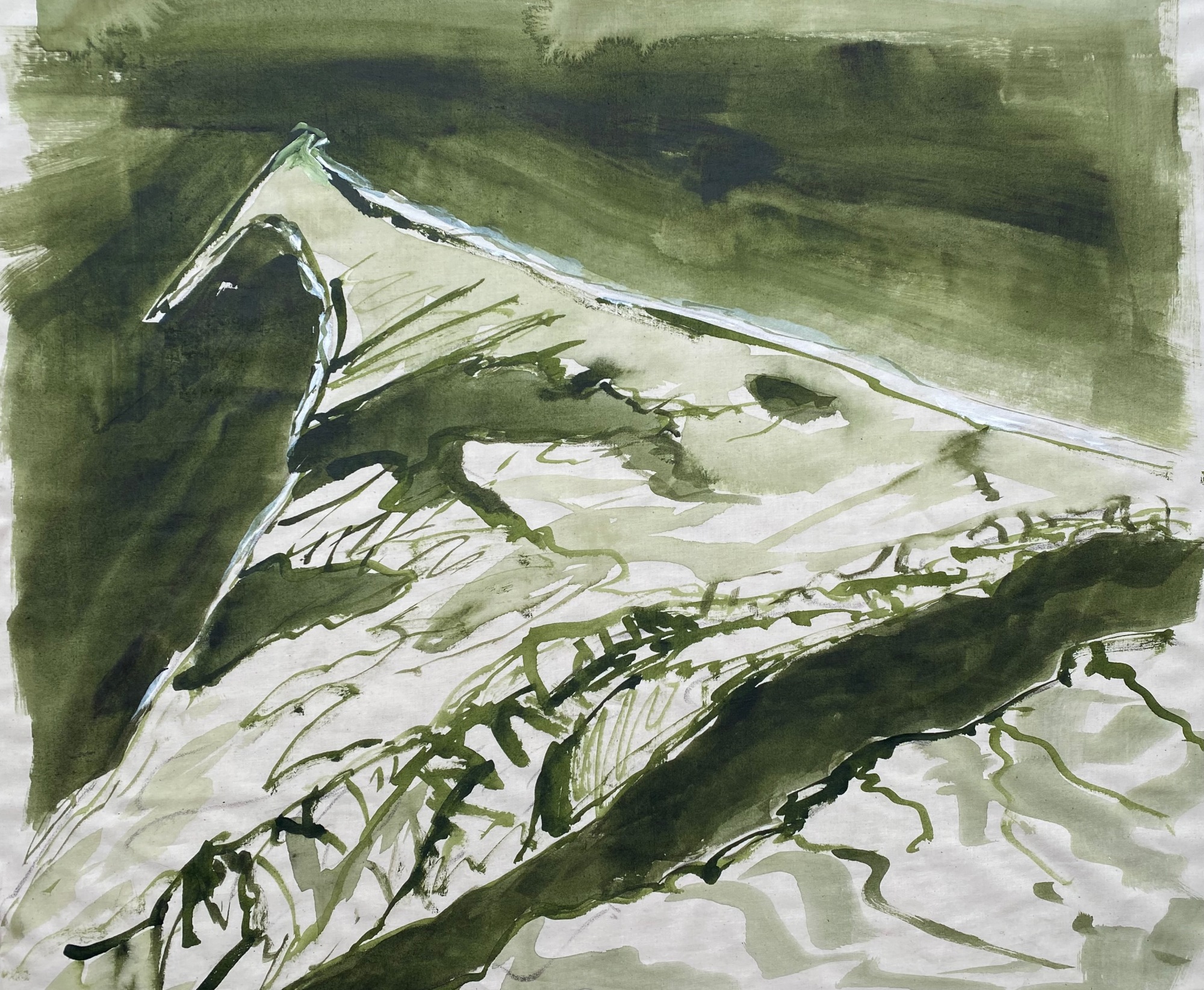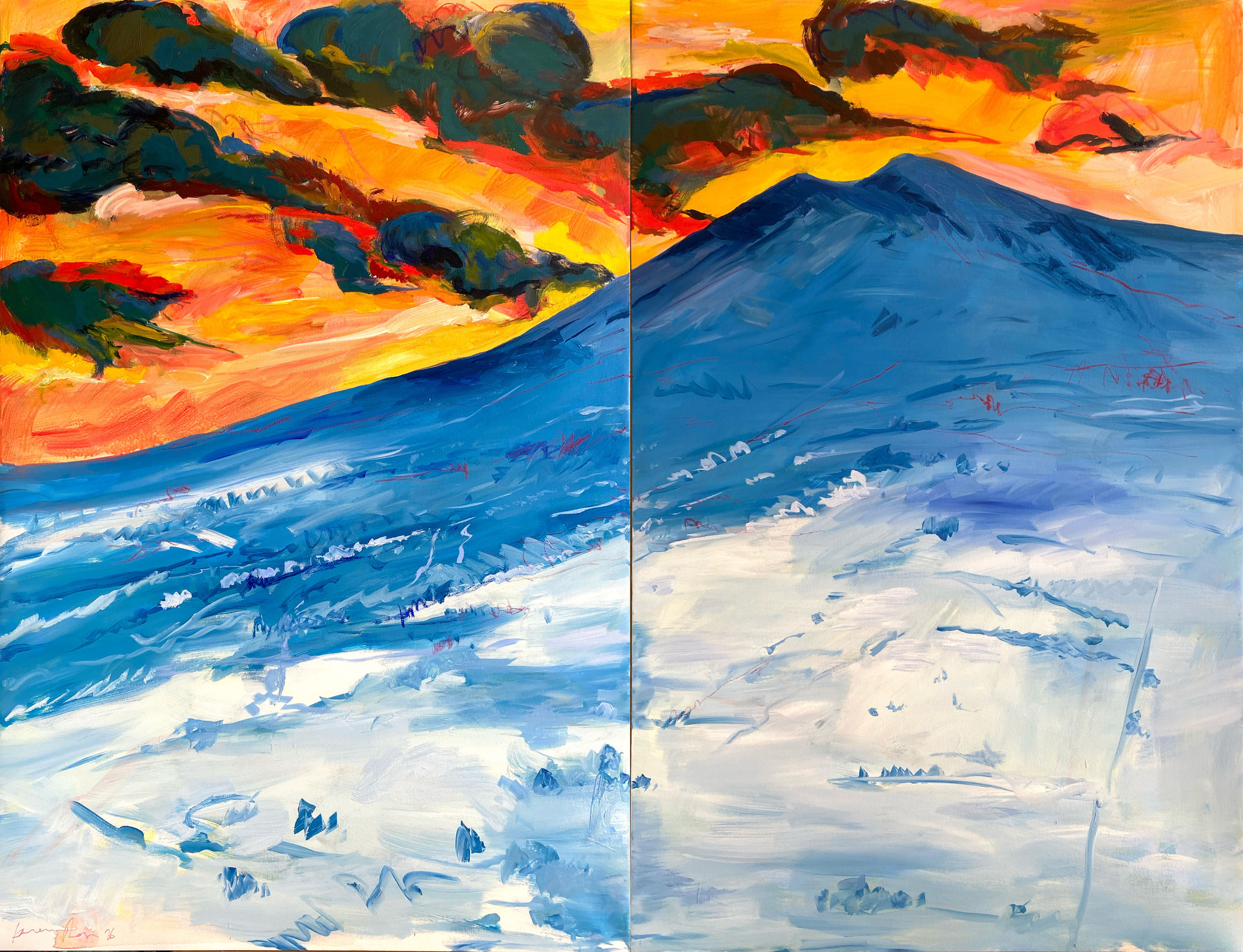 Volcano, 2026 oil, acrylic and pastel on canvas 48 x 64" diptych San Vicente volcano in El Salvador is the site of the notorious CECOT detention center where we have deported hundreds of young men. Erased the prison and inverted the colors of the sky and land since we are living in the upside down world.