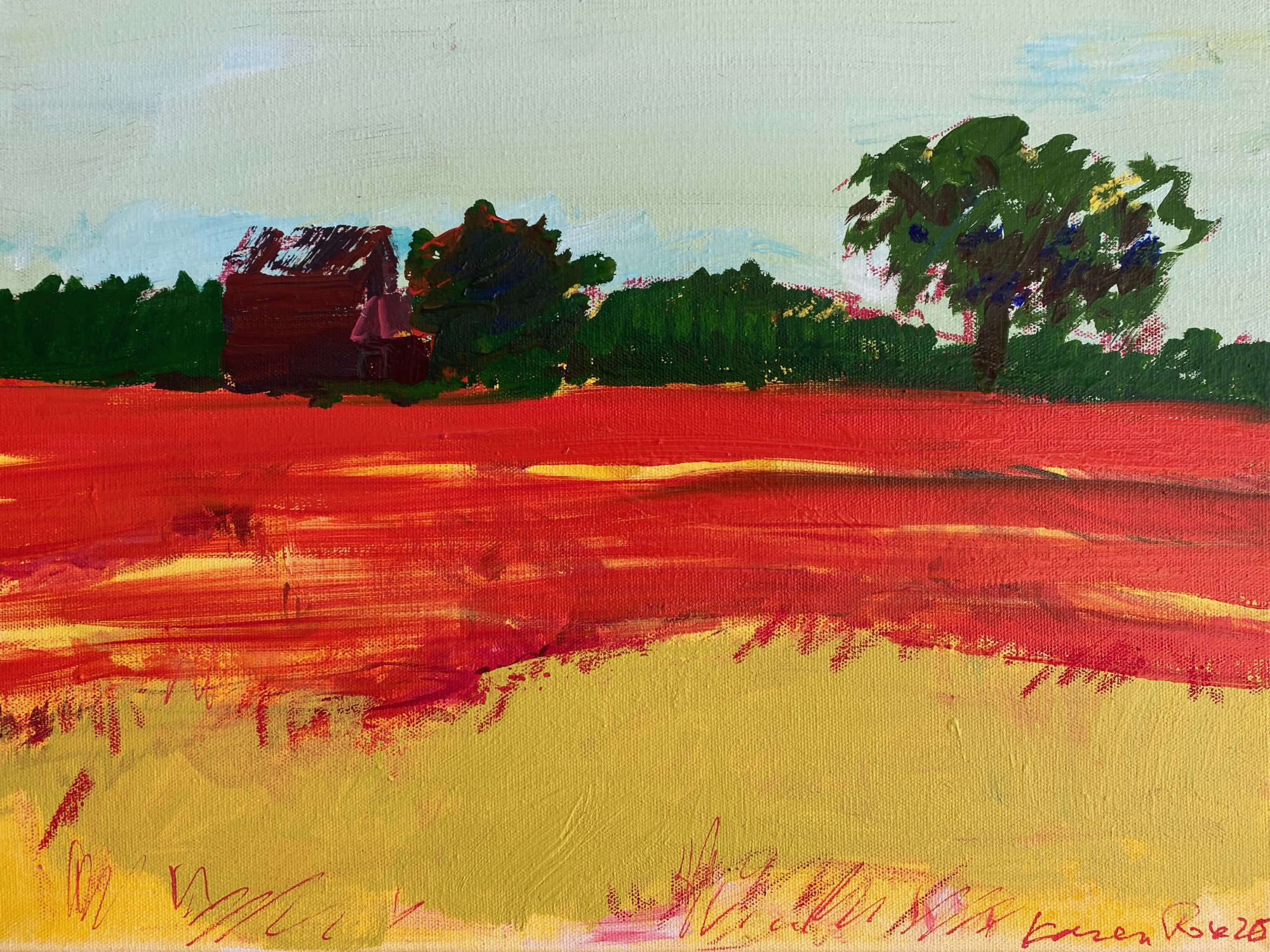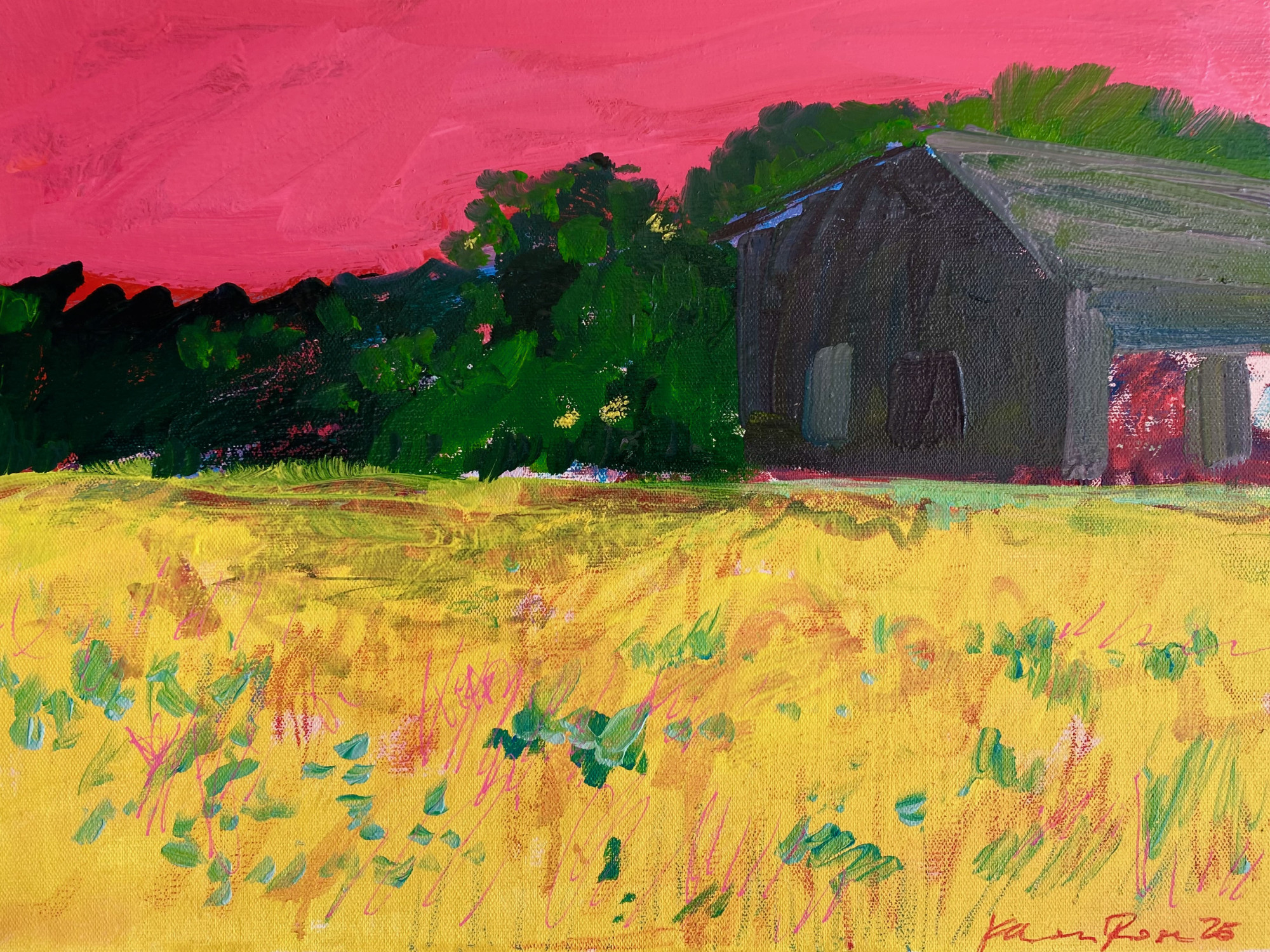 NC Farmworkers 1, 2025 acrylic on canvas 36 x 48" Series honoring Latino farmworkers, based on my photos of farms in Wilson, North Carolina. The color palettes in this series are Mexican, and the labor force is thus implied, while notably absent.