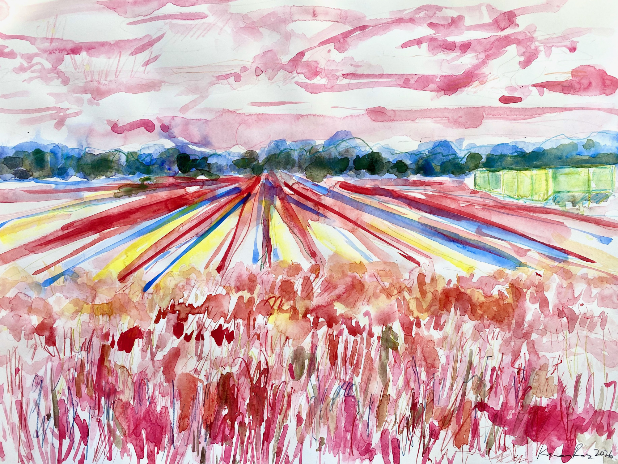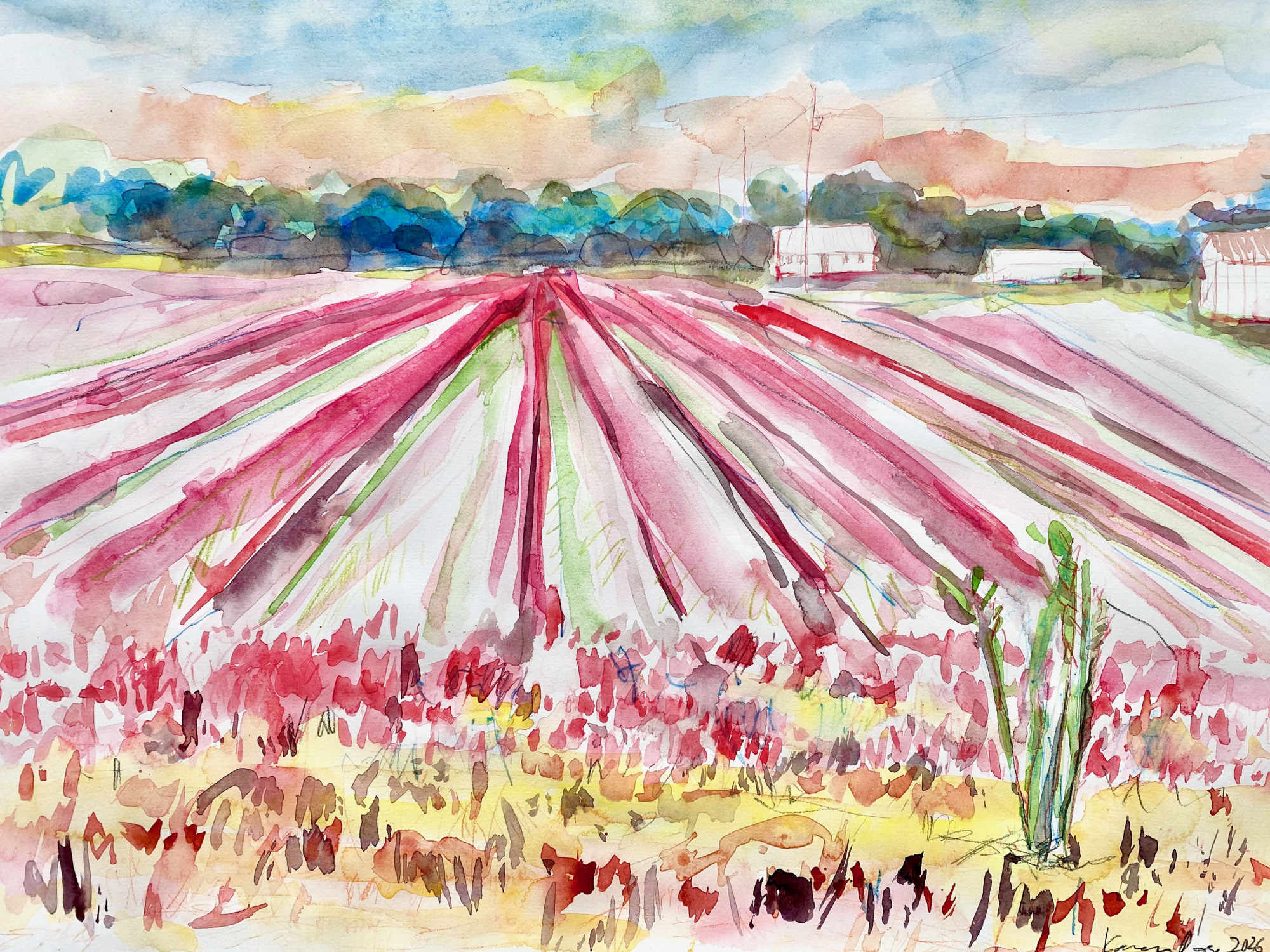 Wilson Farm/Roadside, 2026 watercolor 18 x 24" For my show in June in Wilson, NC honoring the Latino farm working community.